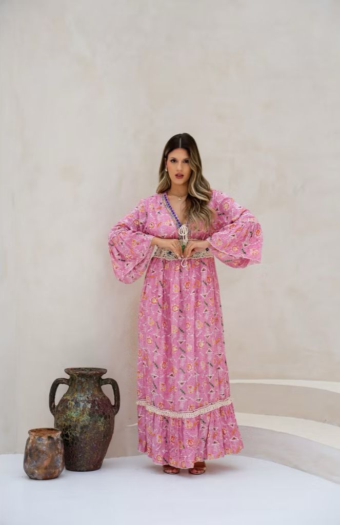 Vestido em algodão forrado, com crochê, manga 7/8 e bordados em pedraria.