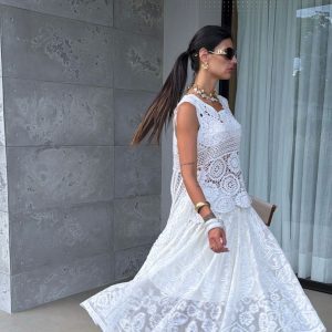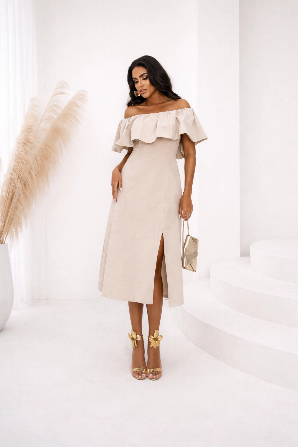 Vestido midi em linho, decote ombro a ombro com elástico, com fenda e fechamento por zíper nas costas.