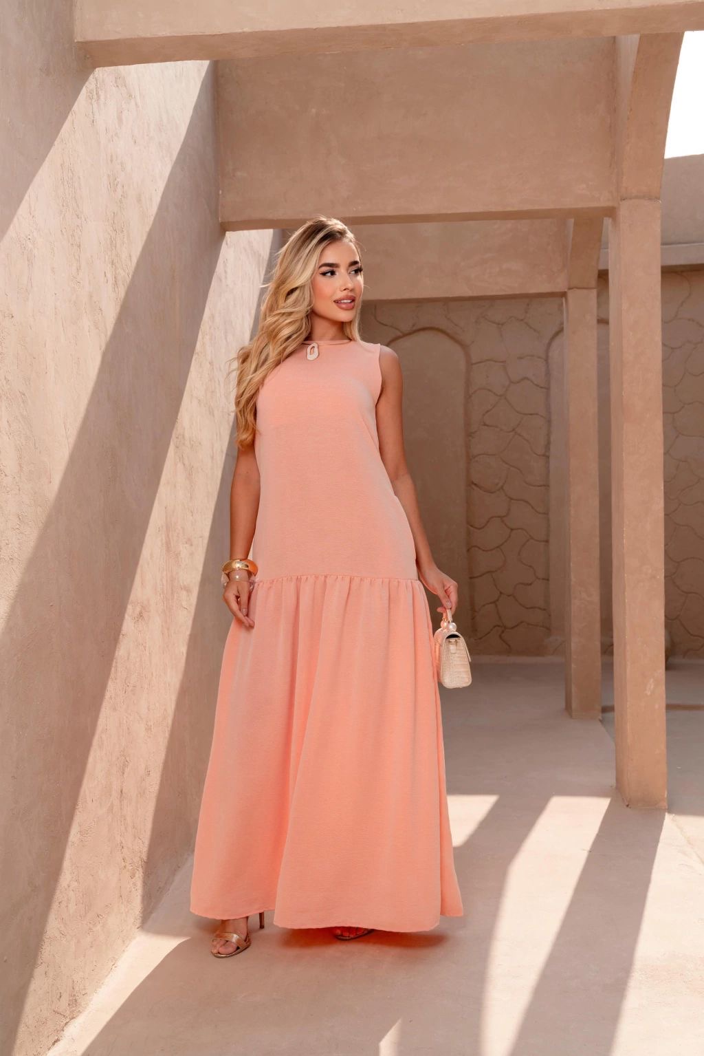 Vestido em crepe duna air flow, comprimento longo, regata e com bolsos.