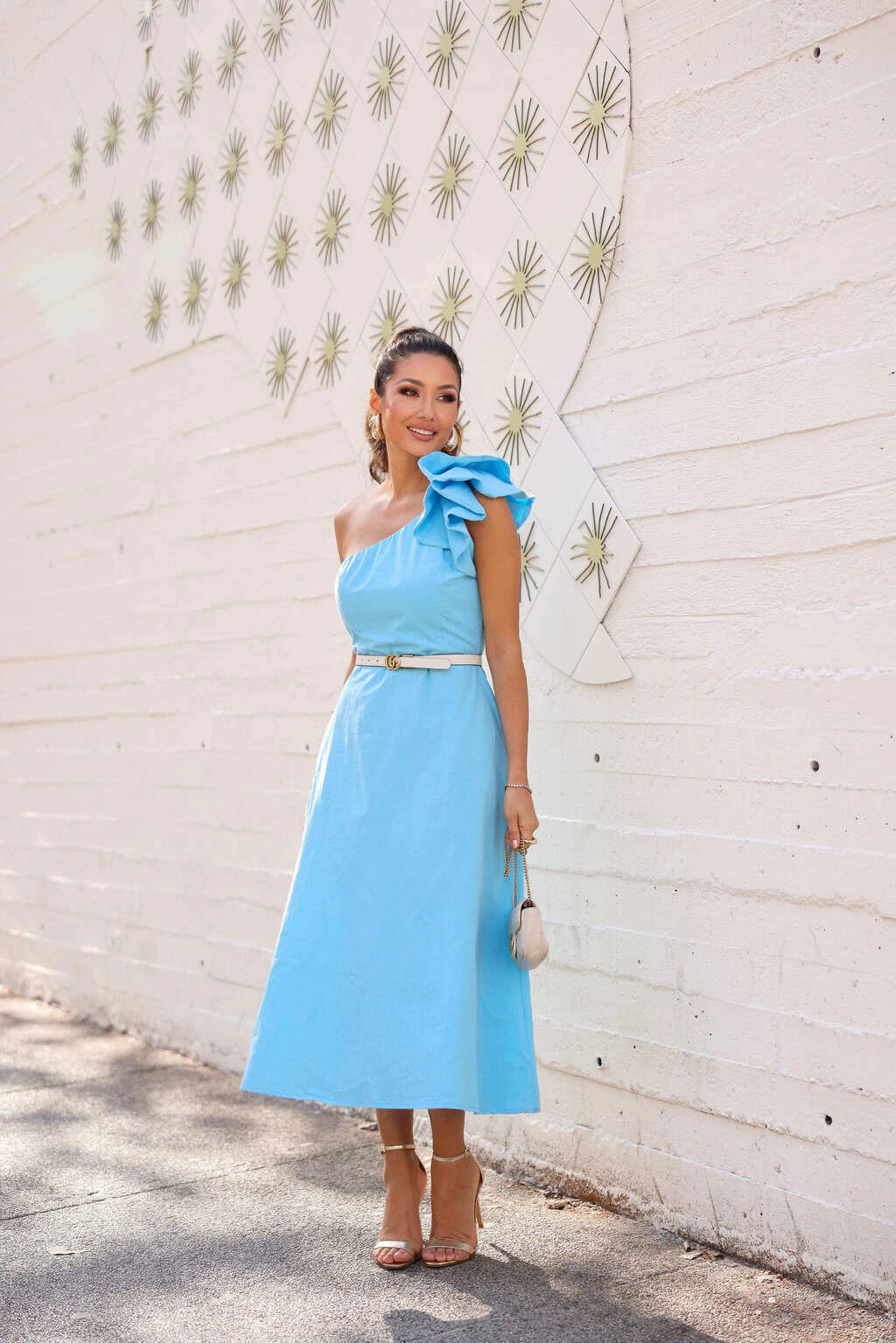 Vestido em Linho, comprimento mídi, manga nula com babado e fechamento por zíper.