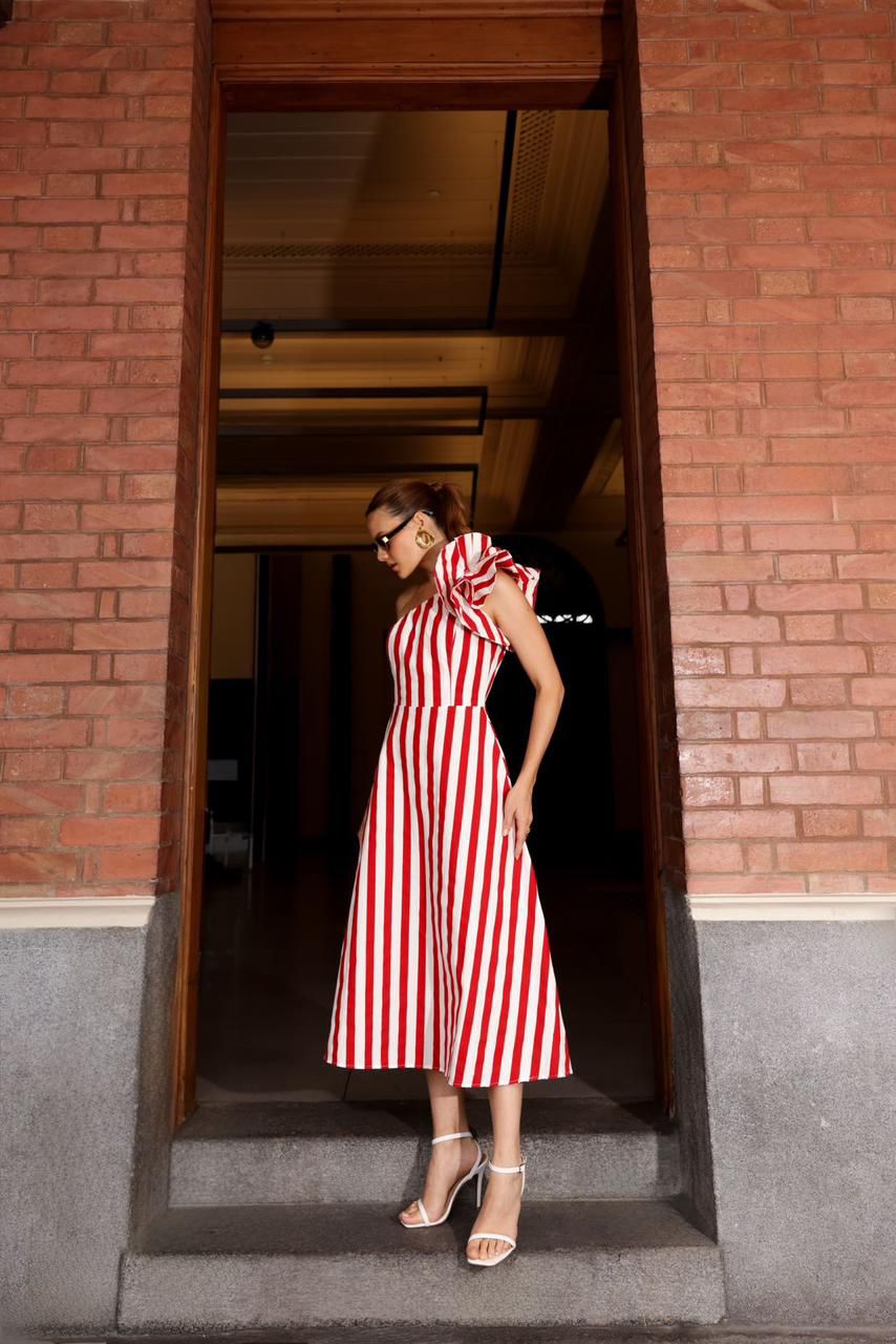 Vestido em Linho, comprimento mídi, manga nula com babado e fechamento por zíper.