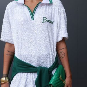 Vestido em ponto roma com elastano, decote V, símbolo bordado e saia plissada.