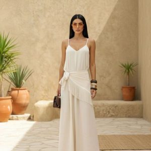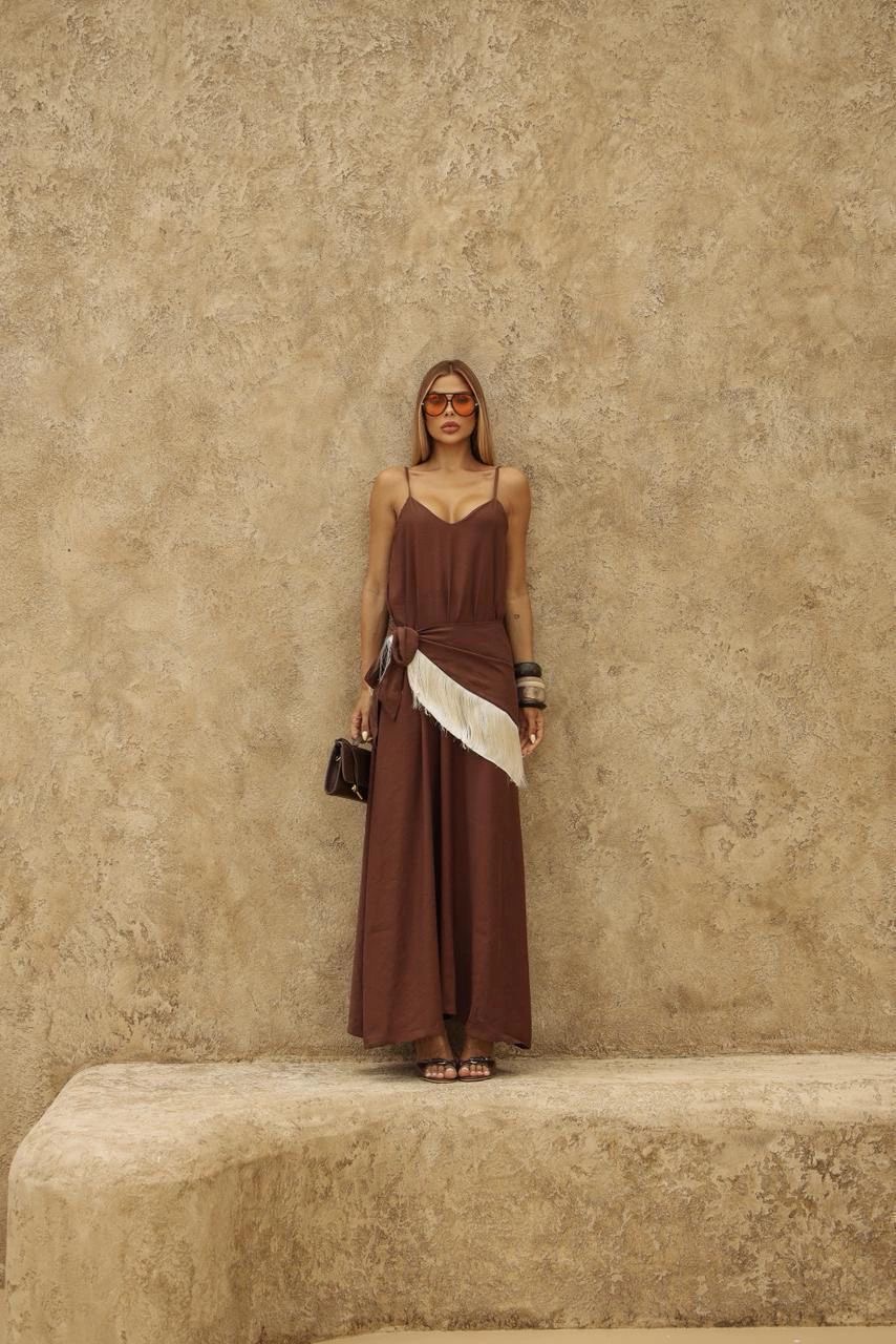 Vestido em alfaiataria, comprimento longo, decote V, alças finas com ajuste Acompanha lenço com franjas com uso opcional.