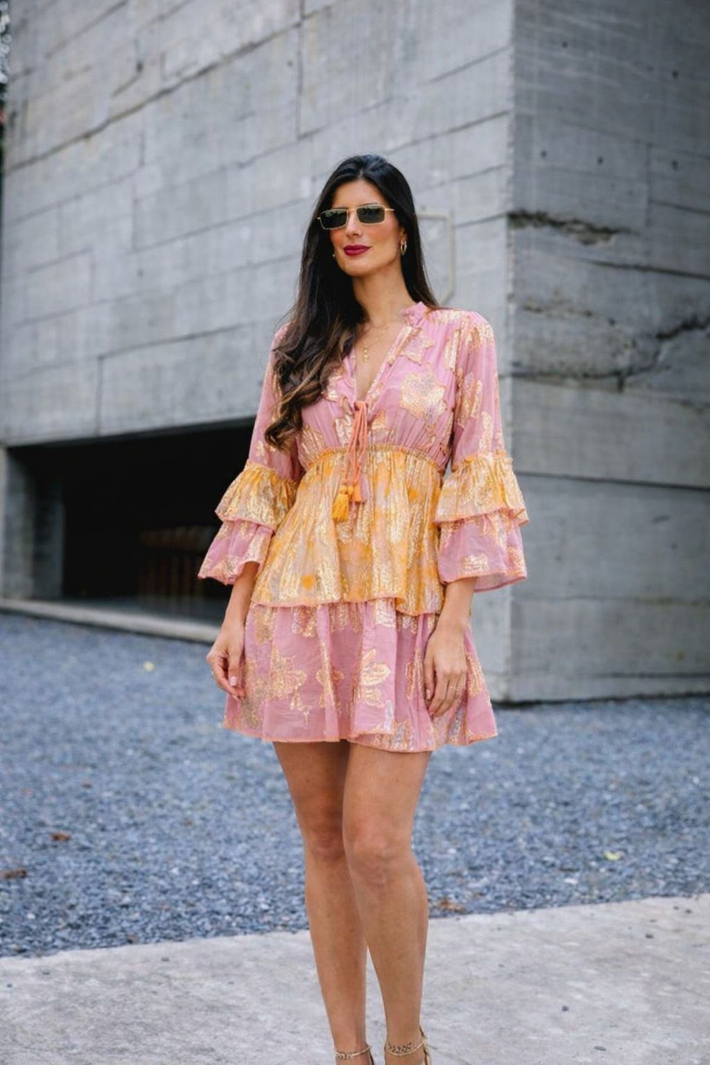 Vestido em algodão forrado com fio de lurex, manga 7/8 com babados, elástico na cintura e decote V.