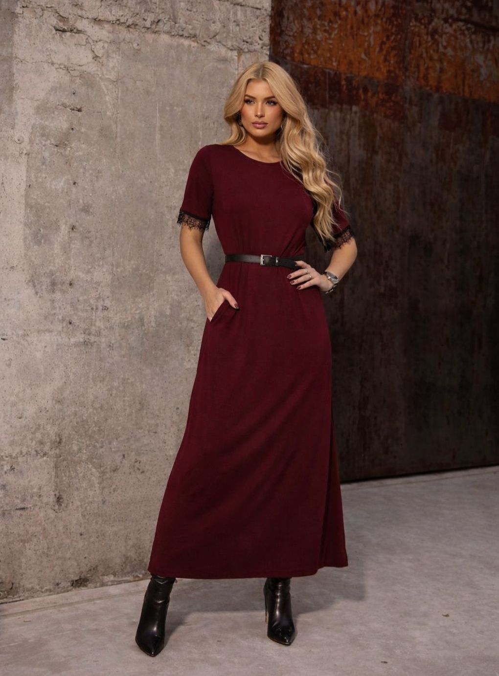 Vestido viscolycra, comprimento midi com fenda e manga curta com renda.