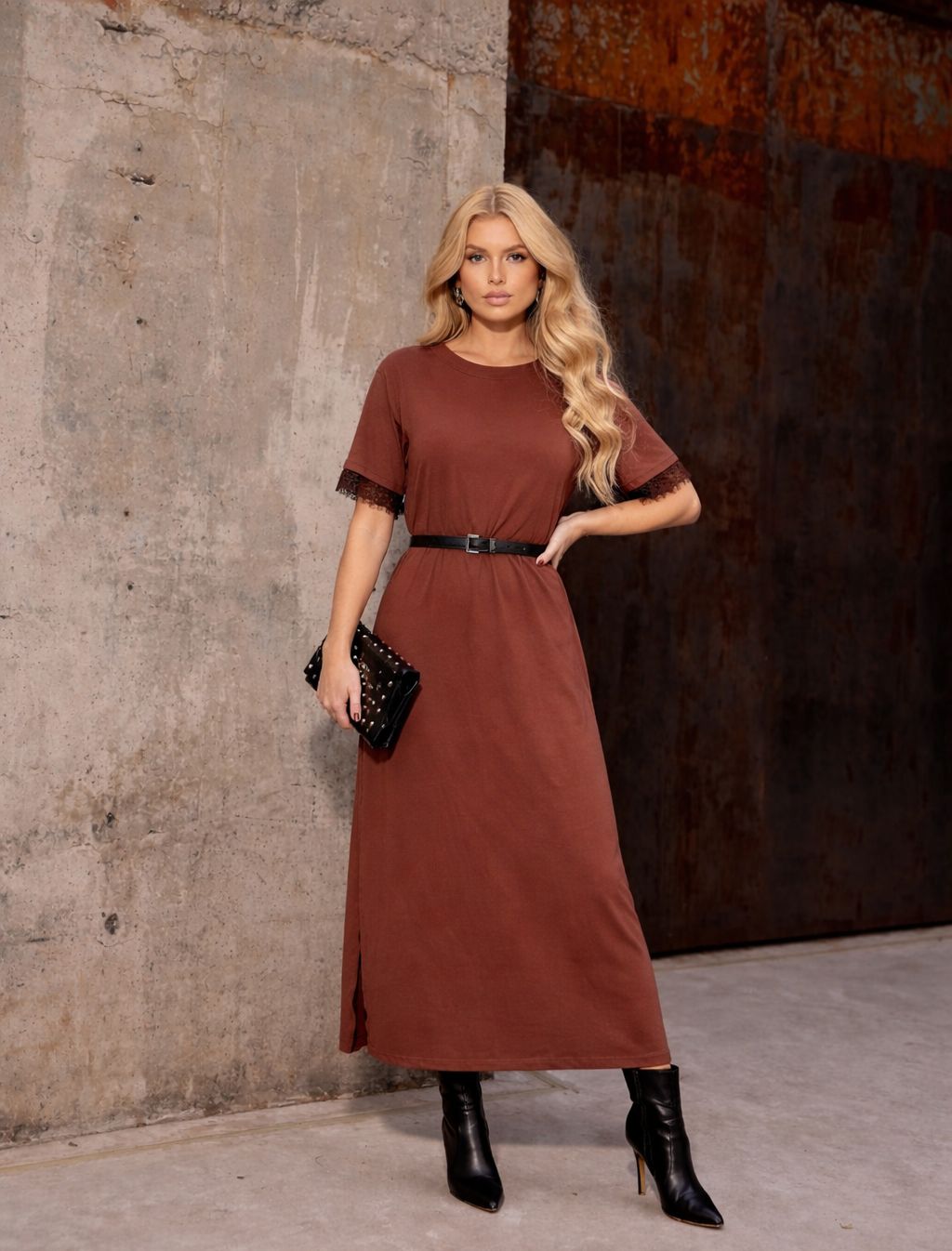 Vestido viscolycra, comprimento midi com fenda e manga curta com renda.