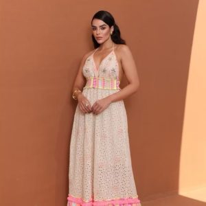Vestido em algodão com forro, comprimento longo, decote V e bordado.