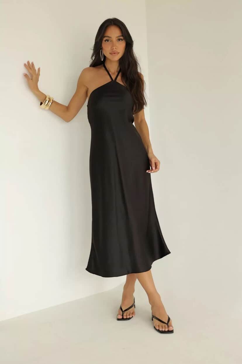 Vestido em cetim, comprimento midi, amarração no pescoço e elástico nas costas