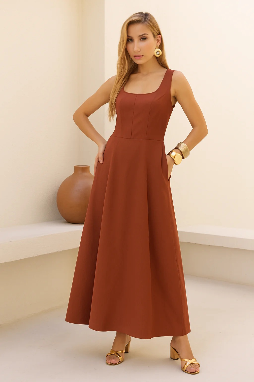 Vestido longo em Alfaiataria Dominique, com alca grossa e elástico nas costas.