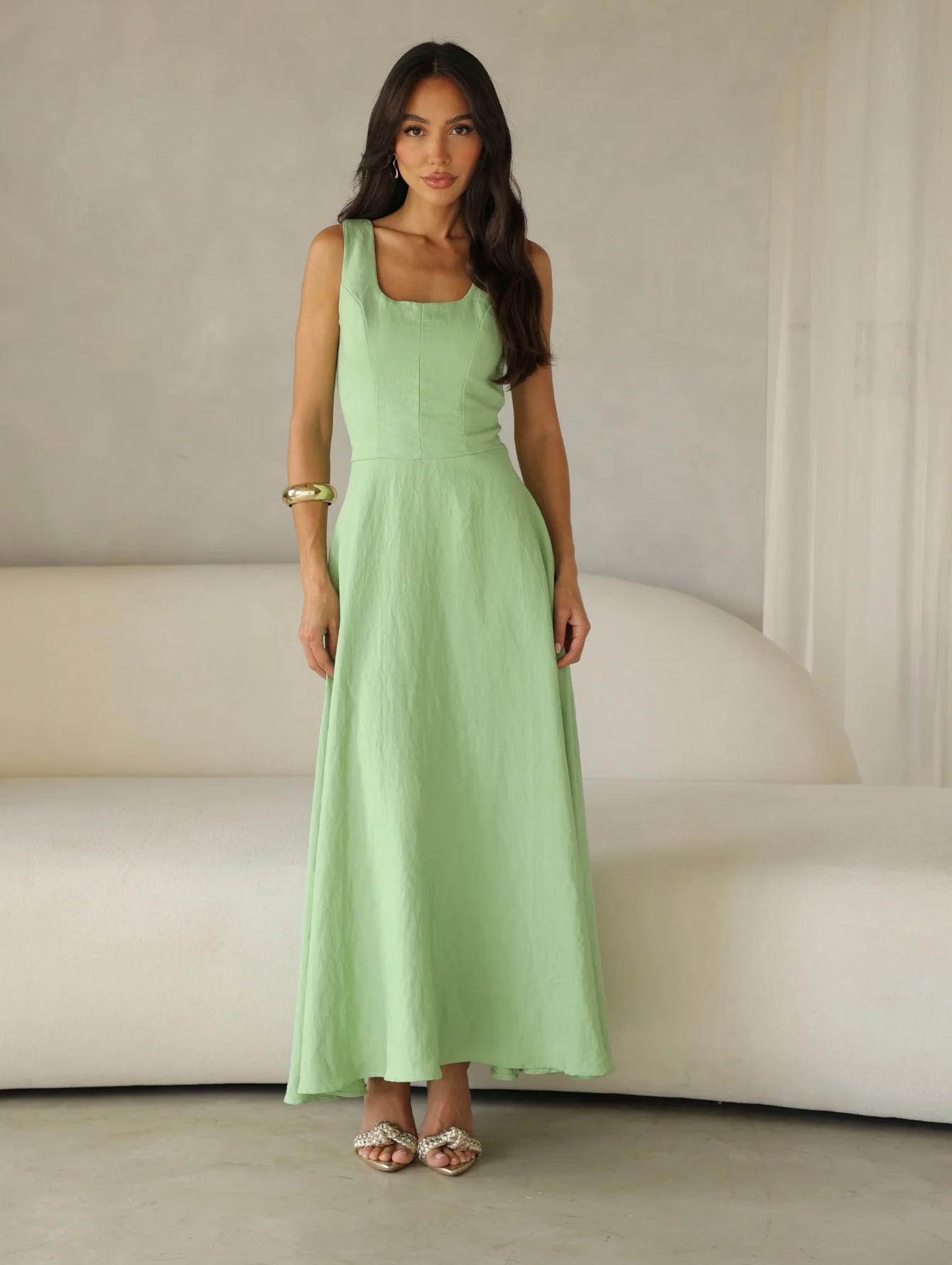 Vestido longo em Alfaiataria Dominique, com alca grossa e elástico nas costas.