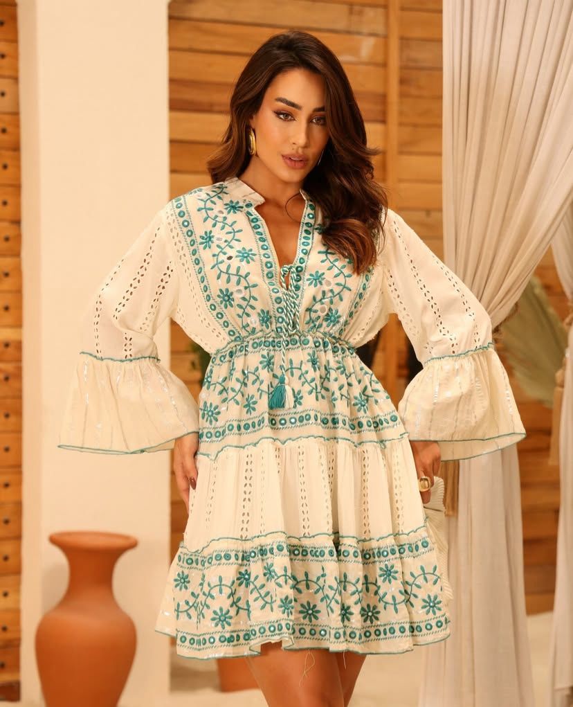 Vestido em laise de algodão, forrado e bordado Manga flare, elástico na cintura, decote V e amarração.
